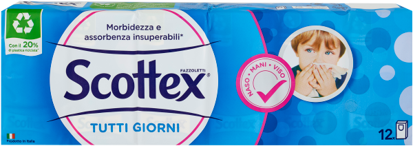 Scottex è il fazzoletto ideale per le esigenze quotidiane di tutta la famiglia. Grazie alla sua morbidezza imbattibile** e alla sua resistenza, Scottex è sempre con te per assicurarti il massimo dell'affidabilità e del comfort.