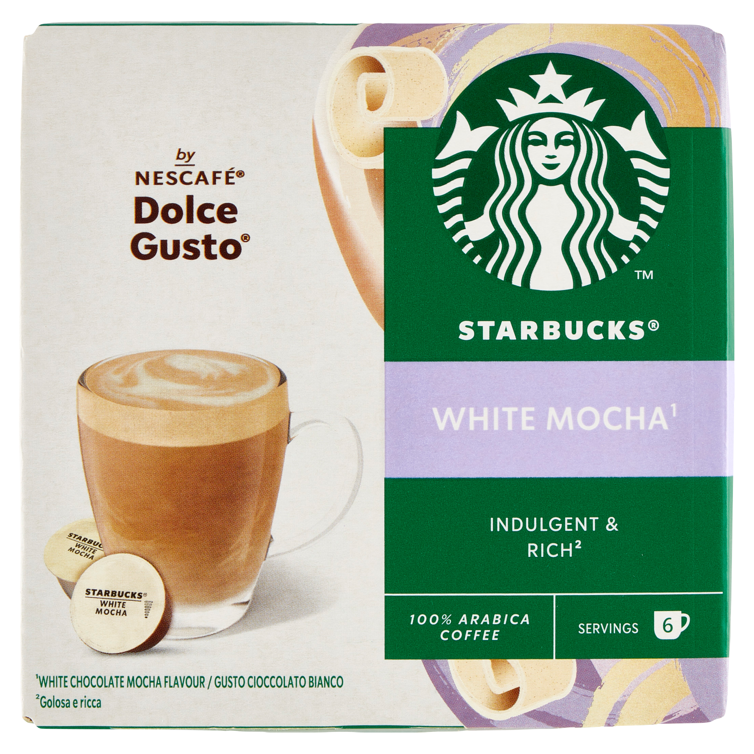 Ispirandoci al White Mocha, un classico di STARBUCKS, abbiamo creato questa bevanda golosa e ricca che potrai preparare a casa utilizzando gli stessi chicchi 100% arabica di alta qualità, come nelle nostre caffetterie. Sapientemente miscelata con latte intero e il goloso gusto di cioccolato bianco, è completata da una soffice schiuma che ti permetterà di gustare una bevanda STARBUCKS squisitamente familiare. Preparala in casa con la tua macchina da caffè NESCAFÉ DOLCE GUSTO.