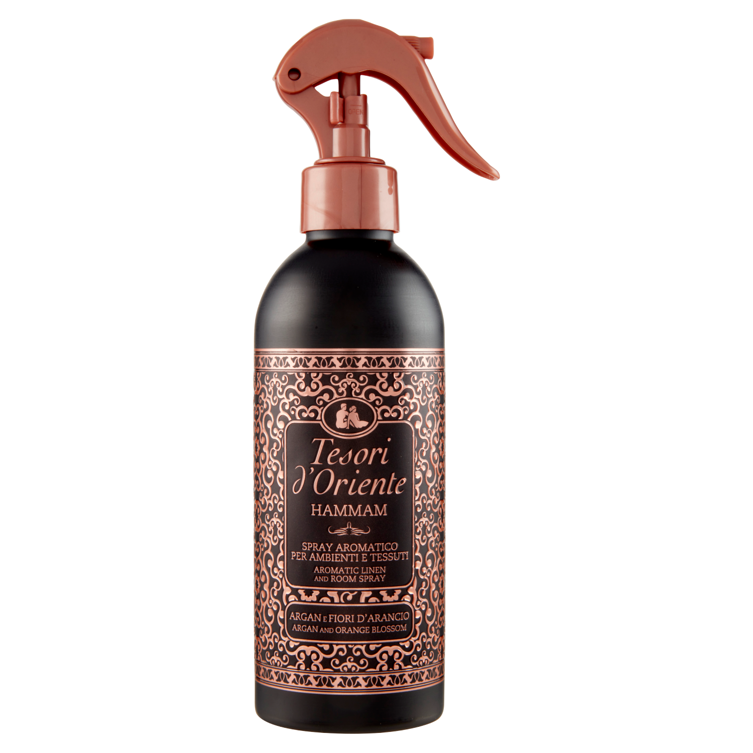 Questo Spray Aromatico profuma istantaneamente l'ambiente ed i tessuti d'arredo con le note intense ed inebrianti delle fragranze Tesori d'Oriente.