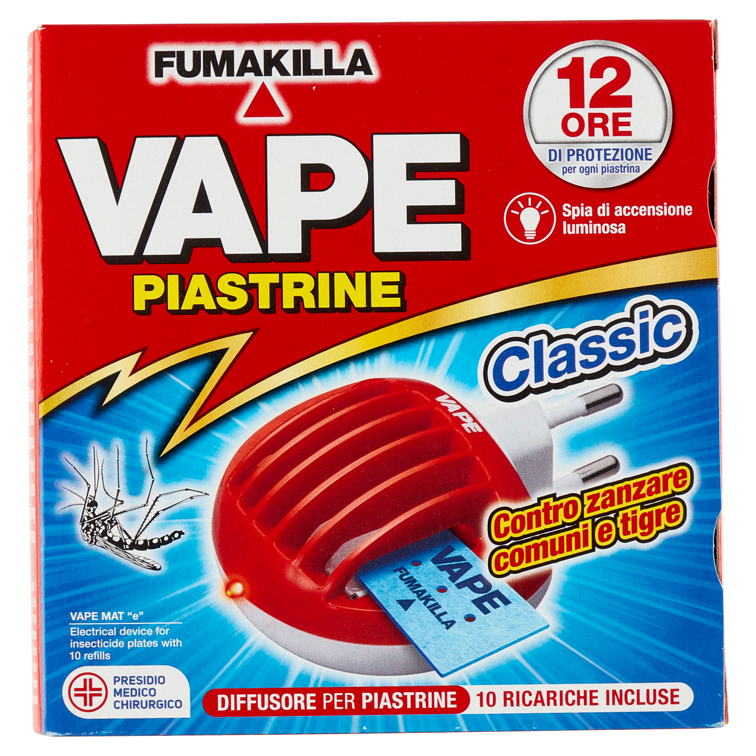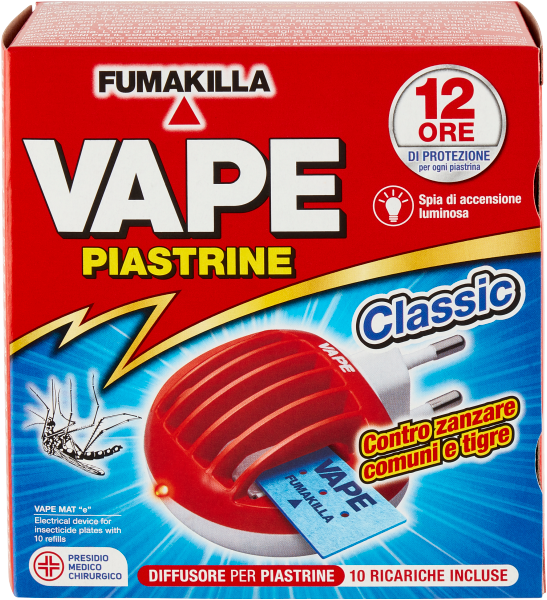 Una piastrina Vape Mat "e" dura 12 ore senza perdere efficacia. Protegge dalle zanzare comuni e tigre (Culex pipiens - Aedes aegypti - Aedes albopictus) esplicando un'azione insetticida in ambienti chiusi e luoghi all'aperto (balconi, portici, ecc).