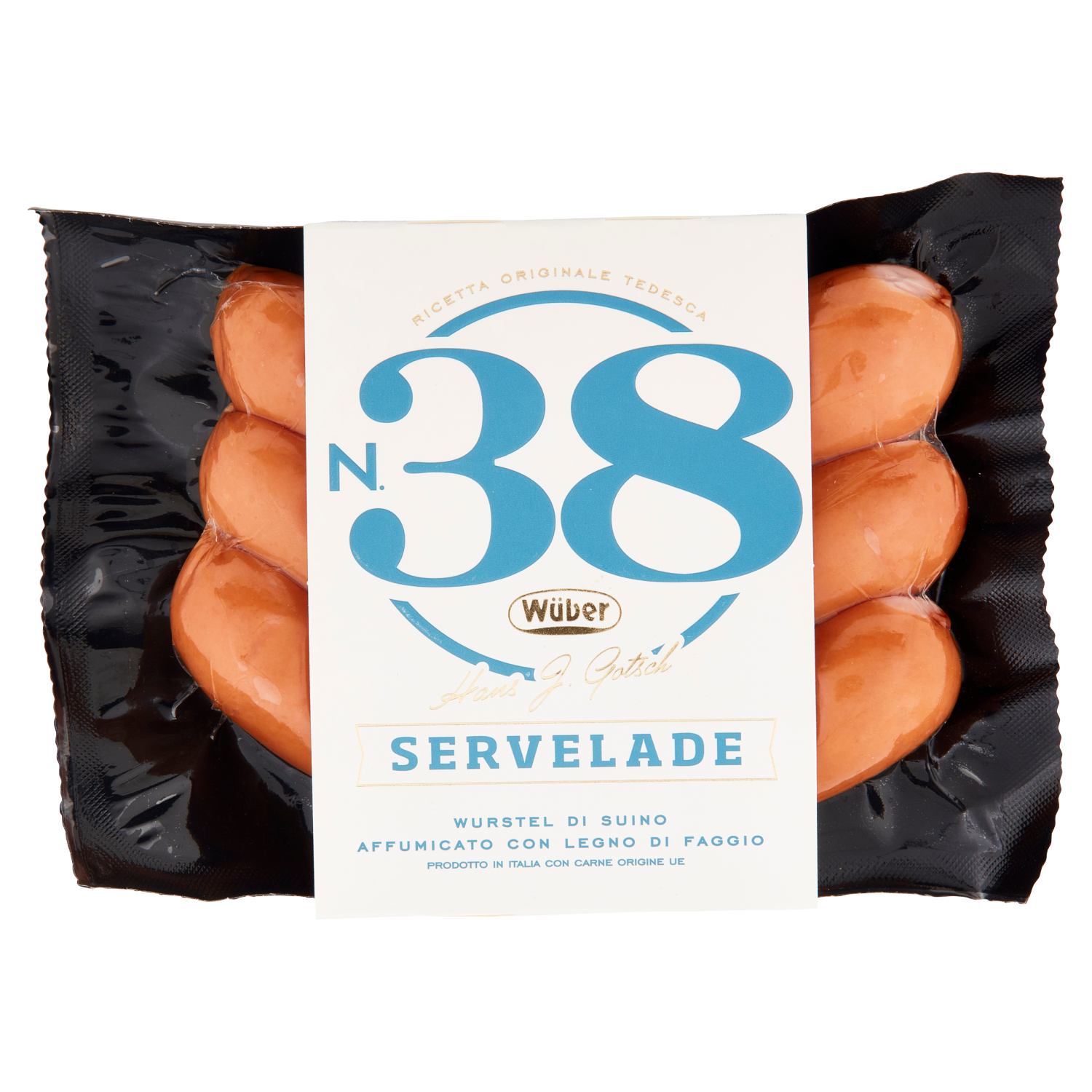 N. 38 è il numero della ricetta segreta di wurstel di altissima qualità insaccati e annodati a mano, cotti lentamente secondo la maniera di Hans Gotsch, primo mastro salumiere Wüber.